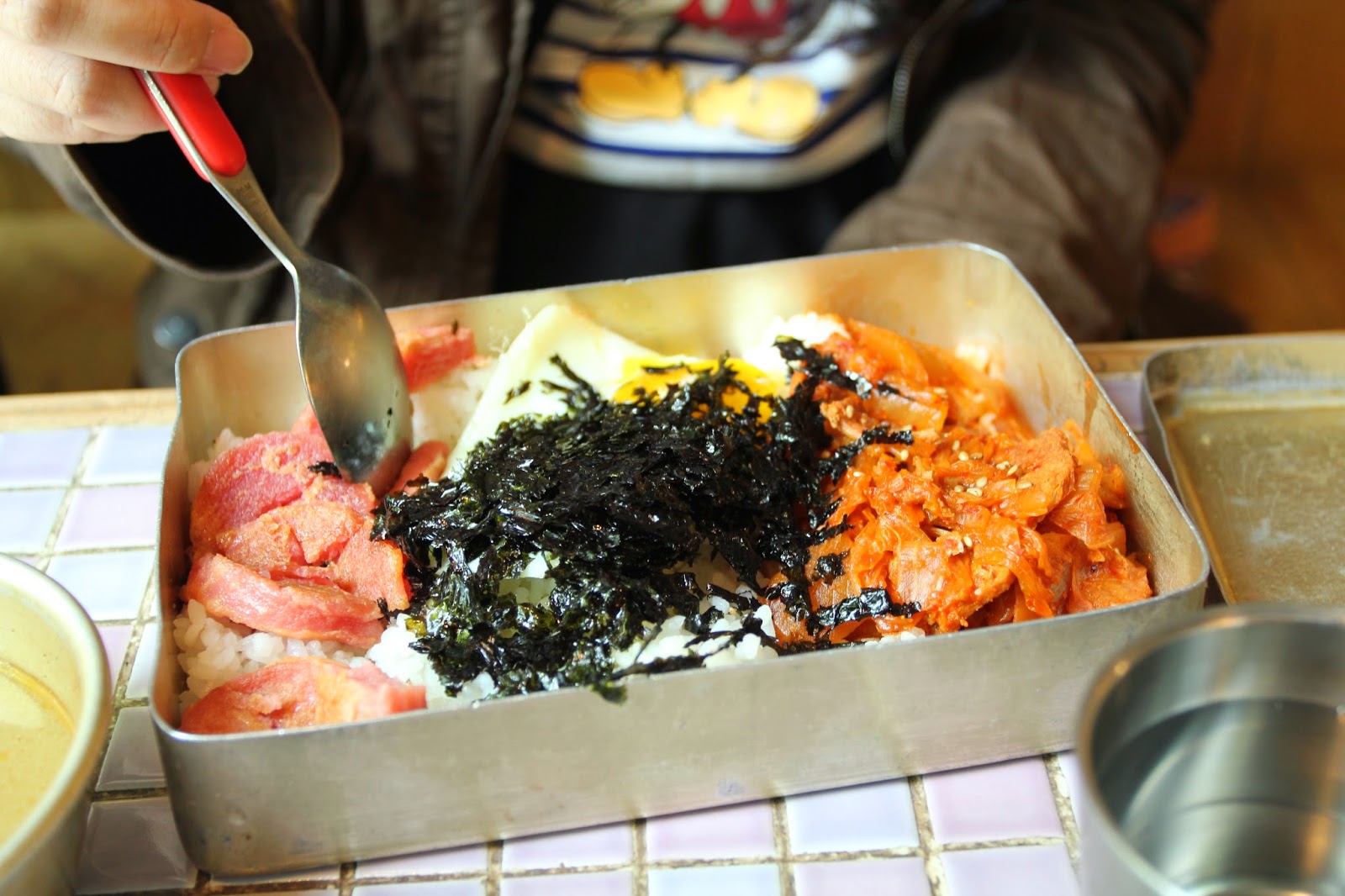 To be very very very honest, Miss Lee Cafe's dosirak is NOT the best we had in Seoul as the best dosirak we had was in Myeongdong. But I'm sworn to secrecy to not spread the location to anyone by Min soooooo if you really wanna know badly where to find the best dosirak we had, please do come ask me personally! :> Miss Lee Cafe's dosirak is so-so to me, maybe because I did not really like their kimchi and luncheon meat as the kimchi used was more towards to sour side, whereas I'm a fan of spicy and slightly salty kimchi (like the Bibigo kind). I find that Kimchi is a key ingredient in the dosirak, so if you want to try making dosirak yourself, do use good kimchi! I tried making a few times and my friends all said it was pretty good hehehehehehe.