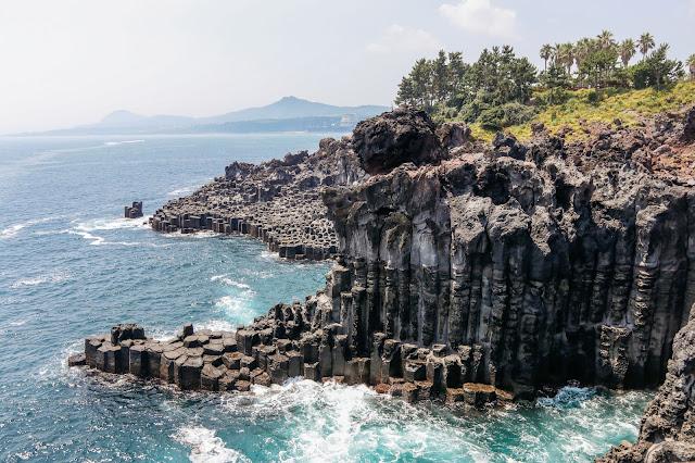 After a disappointing morning at Soessokak Estuary, and a not very decent Jeju Black Pork lunch, the Korean winds brought us to Jusangjeollidae, which is a coastline of rock pillars piled up against each other. It was formed from lava when Hallasan, the tallest mountain in Korea (which is situated in Jeju), erupted. These rock formations are similar to the ones seen at Black Sand Beach (I almost typed bitch) in Vik, Iceland.